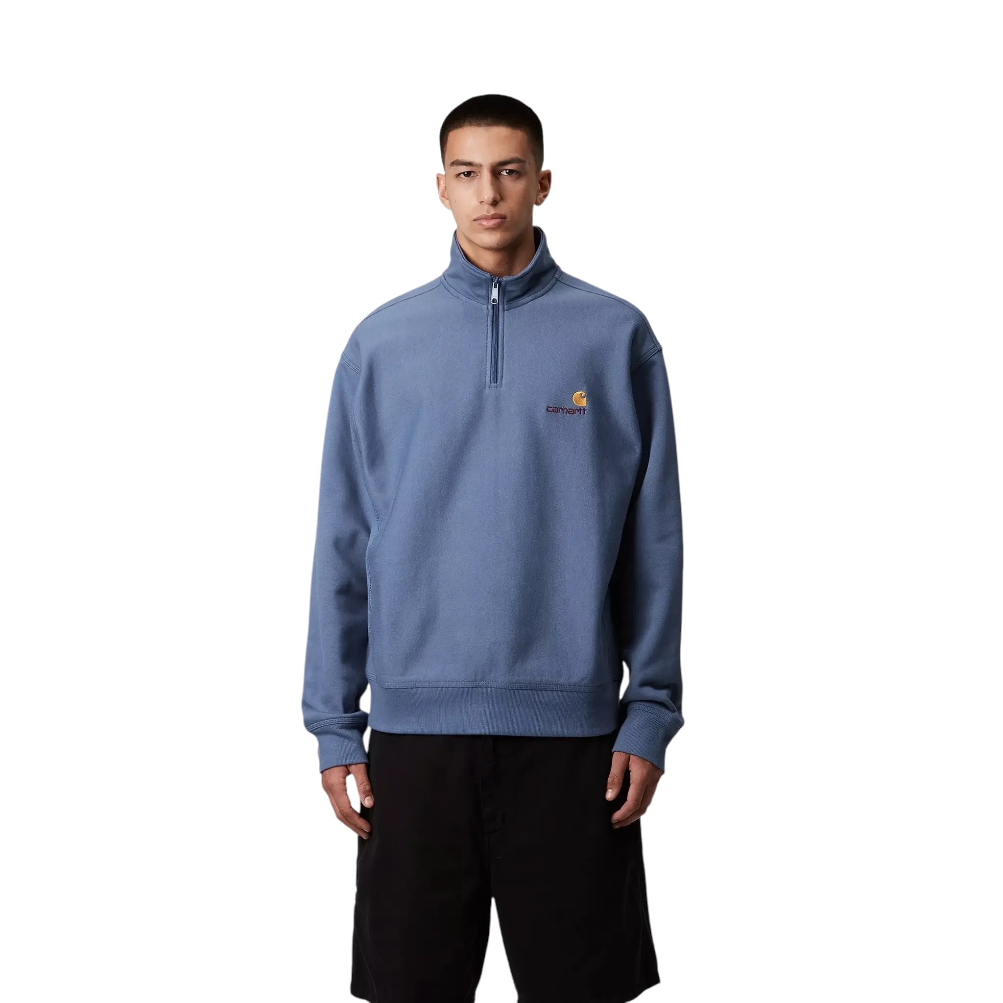 Le modèle Half Zip American Script Sweatshirt est confectionné à partir d'un mélange de coton et de polyester de 12,3 onces et brossé pour plus de douceur et de chaleur tout en préservant sa respirabilité. Le vêtement est doté d'un col montant avec fermeture zippée et un petit logo. Il présente une coupe ample et carrée.